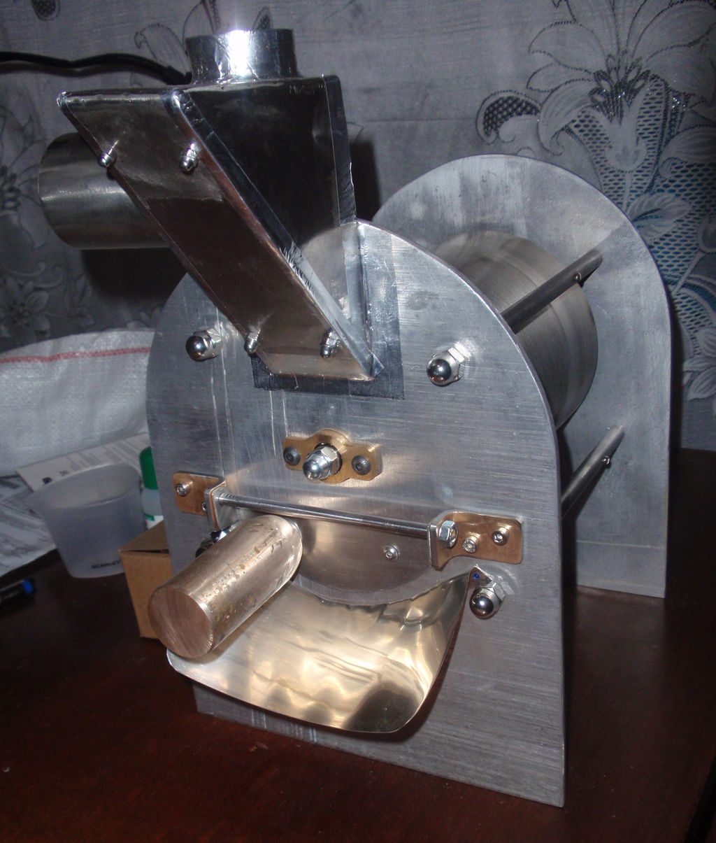 Загрузку для зерна гнул из листа нержавейки 1мм, ох нелёгкая задача была, приходилось использовать в качестве оправки 5мм уголок шириной 50мм и постоянно подтачиваеть его чтобы выгнуть молотком в той или иной плоскости. После гибки выфрезеровал отвертия под трубы для засыпки и тяги, а потом заварил инвертором электродами по нержавейке и зашлифовал болгаркой. очень хреново варить инвертором, т.к. норовит пропалить дыру. Для тяги шелухи под циклон приварена труба 50мм. Дверцу для высыпания обжаренного кофе сделал из двух частей. Из 4мм плиты, что и стенки делались и 1мм нержавейки, чтобы при закрытии дверцы плоскость была заподлицо со стенкой и ничего не мешало перемешивать зёрнам. Направляющий козырёк для высыпания кофе сделан из тонкого листа нержавейки 0.4, более чем достаточно для этой цели.