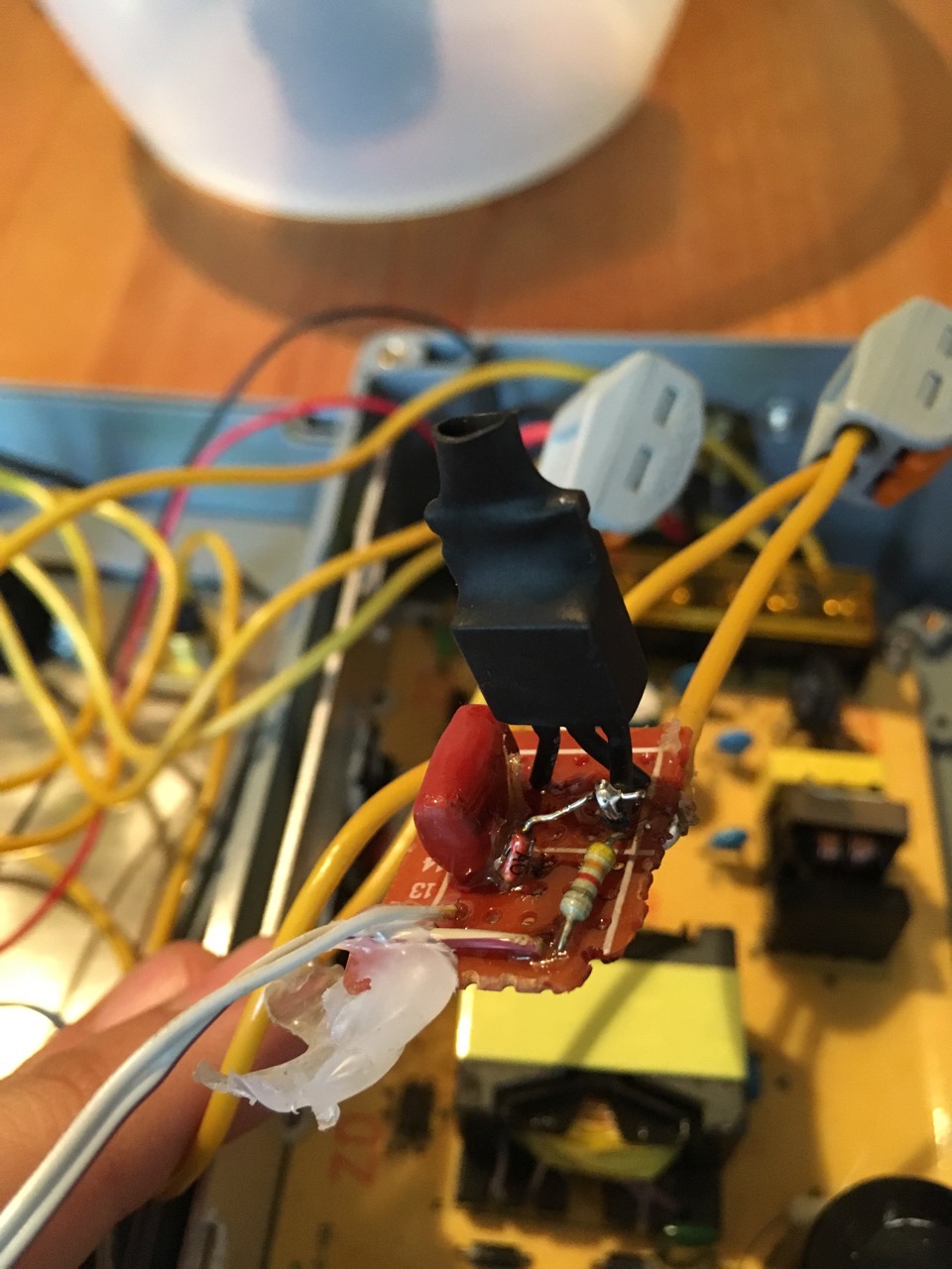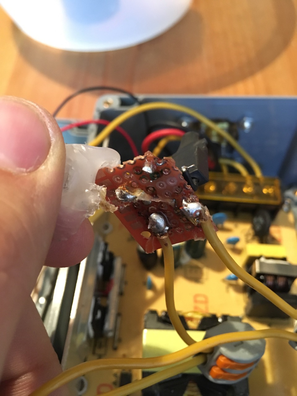 Идем дальше — от регулятора оборотов вентилятора вытяжки идут два провода к комку термоклея и изоленты. Разматываем… Огрызок макетной платы с отвратительным навесным монтажом элементов — это самопальный диммер. Мало того, что диммером нельзя управлять моторами, которые для этого не предназначены, так они еще и пожалели 150 рублей на нормальный диммер из магазина и собрали на соплях свою схемку. Причем судя по пайке делали это первый раз. Я, кстати, до сих пор не понял, что в этом блоке управления было получено из-за границы и ожидало растаможки?