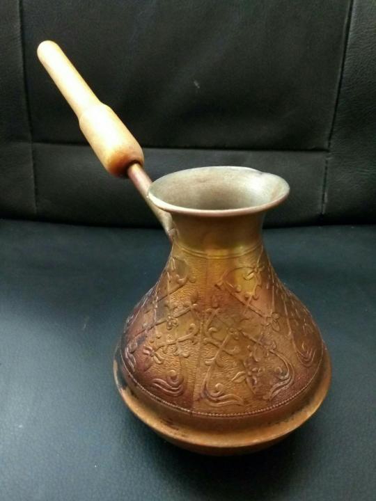 Выбирайте медные, покрытые внутри оловом (или серебром, но обычно это только SOY). Горло на 20% уже, чем донышко. Чем толще медь, тем лучше. Оловянное покрытие внутри должно быть целым, без просветов меди. Не берите без надобности полулитровое корыто. На одного человека достаточно турки объёмом до 280 мл. Подробнее тут: -[ссылка]-