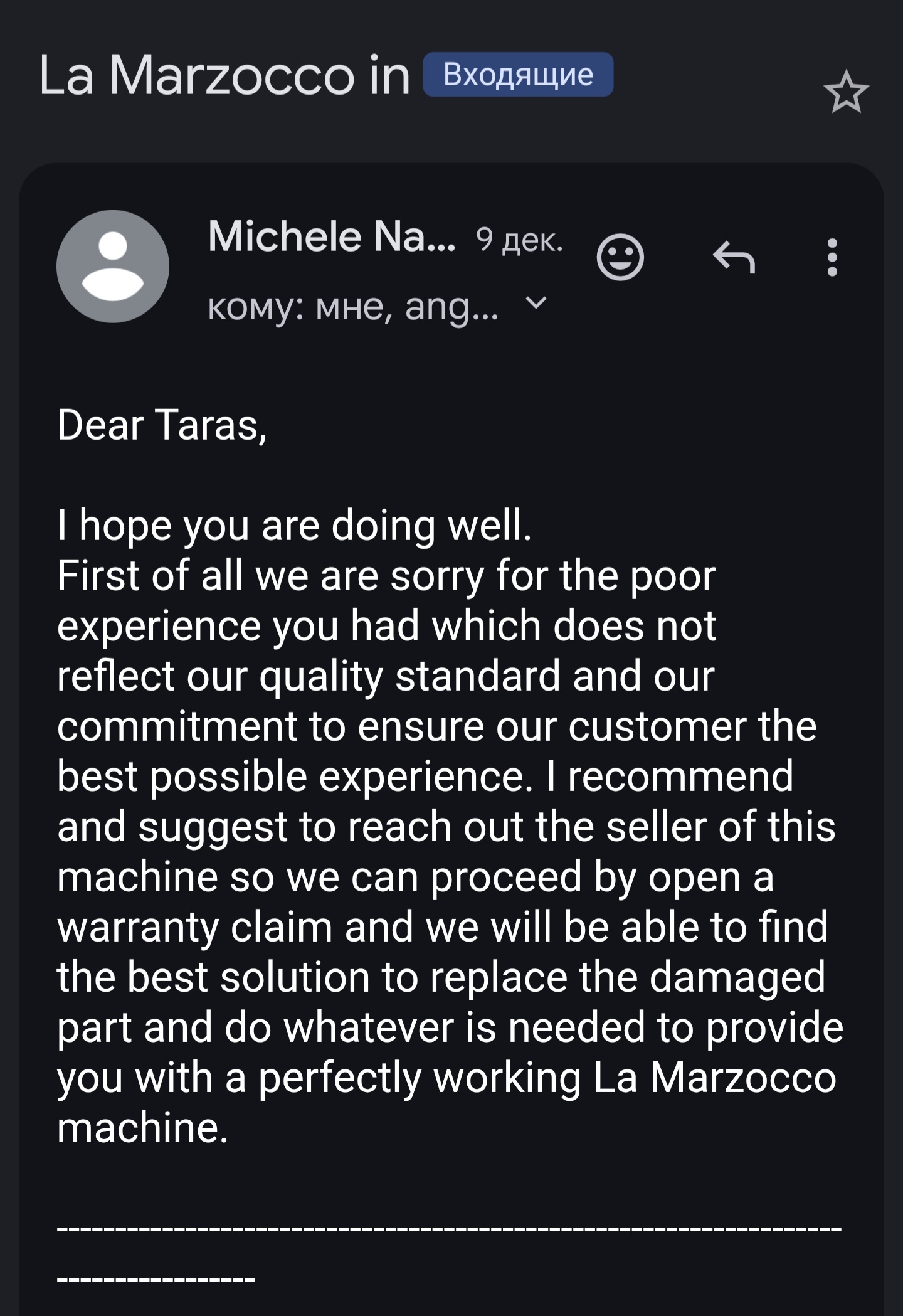 Всем привет!Отзыв о покупке кофемашины в italinea.В середине ноября списался с Олегом уточнили все детали,28 ноября сделал оплату usdt за аппарат la marzocco linea mini r из наличия,был предупрежден Олегом что до НГ можем и не успеть т.к хотел получить до НГ.В итоге 24-го декабря получил весточку что аппарат в Москве и можно забирать со склада.Забрал на след.день,все в идеале как и расчитывал,все счастливы)Спасибо Олегу за классный аппарат и быструю доставку.Всех с наступающим НГ!