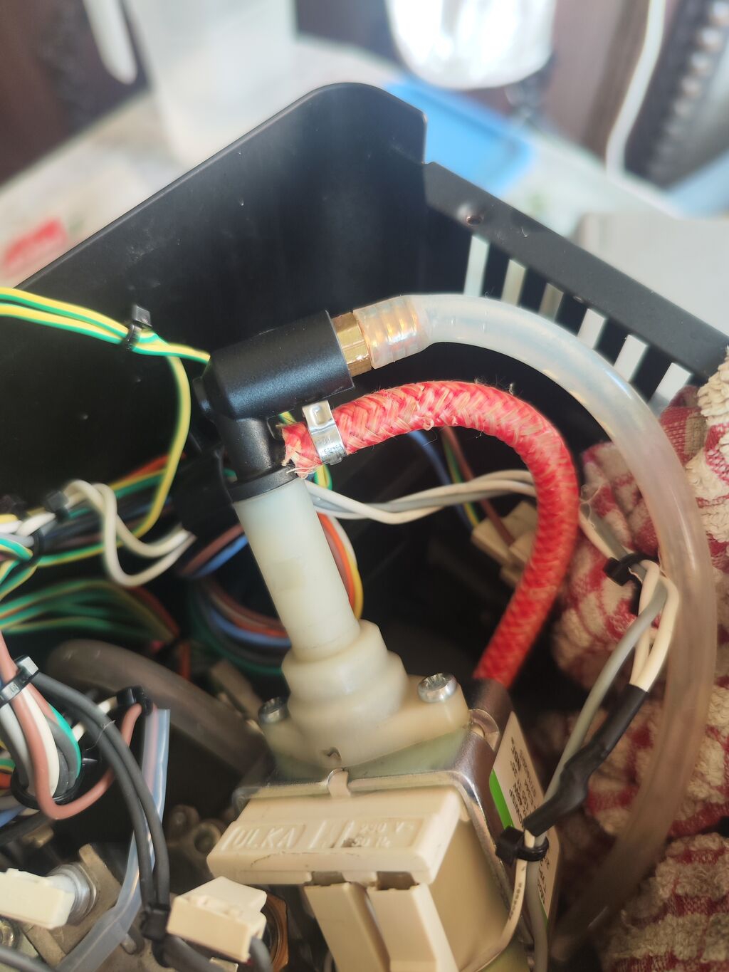 Вопрос тем кто разбирал эту модель гаджии и в частности черный клапан, который стоит на выходе помпы и раздает воду в две трубки - прозрачную аварийного сброса и красную в бойлер. Должно ли внутри этого клапана быть что-то кроме пружины? Может там должен стоять шарик или грибок и я его потеряла при разборке? Это он не перекрывает аварийный сброс.