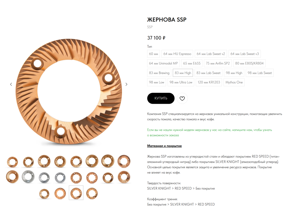 Продаю жернова SSP HU 83мм. Пользовался год. Две порции кофе ежедневно в течении года, в отличном состоянии. В прошлом году продал молку, жернова лежат, решил продать. Может кого порадуют. В Renoir.coffee стоят 37000 руб. Продаю за 19000руб. Доставка за ваш счет.