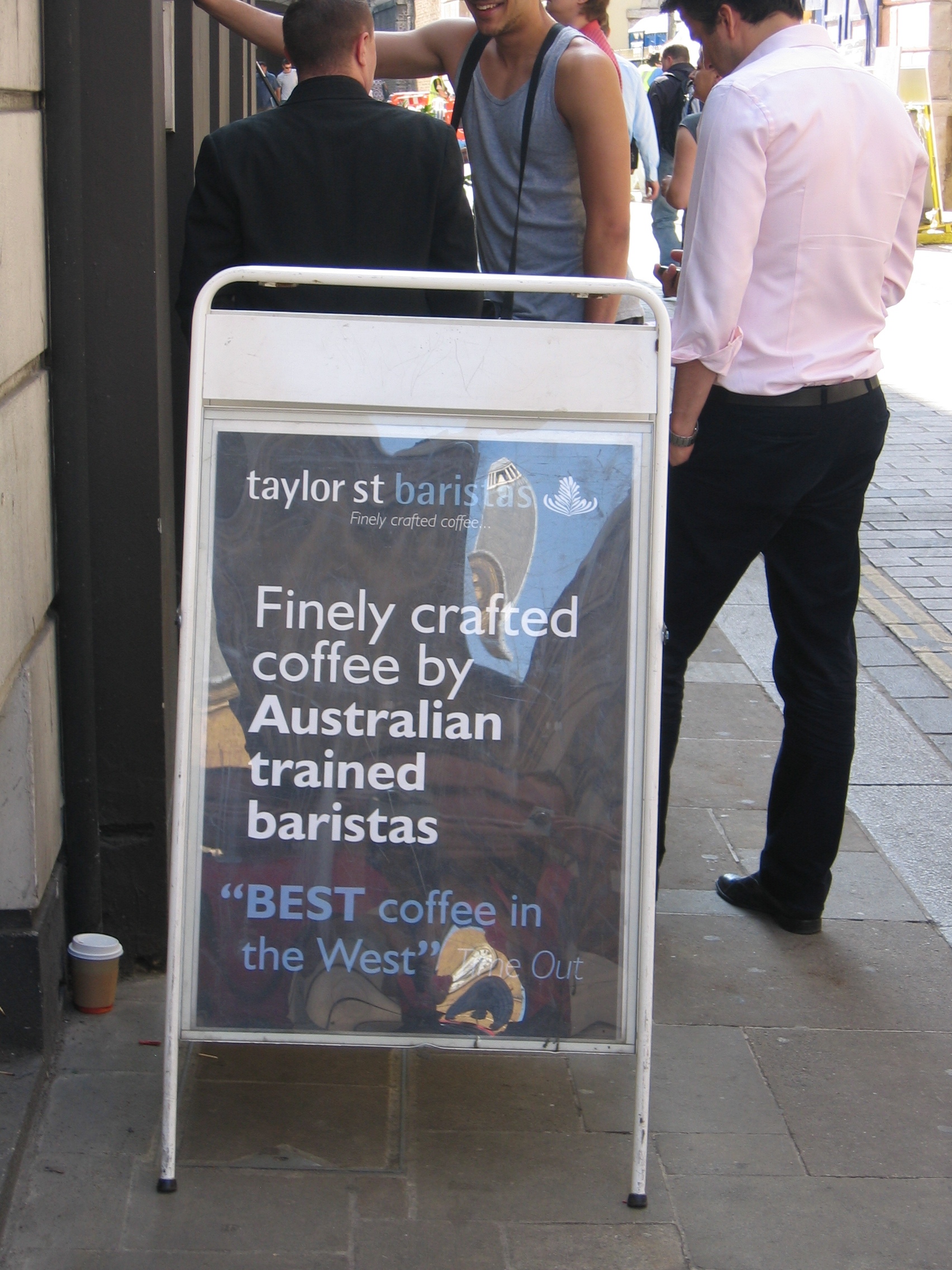 вернулся из лондона. Думал там дорого - нифига! Вот сижу в киеве в арома эспрессо бар - пью эспрессо за полтора фунта и "флэтвайтовский" капучино за 2.5 фунта!!! Также искренне понял, шо придирался к английским коллегам. После 2х чашек эспрессо в украине - вчера в кофекарте тц плазма и щас в ароме - опять хочу в NudeEspresso!!!