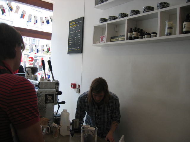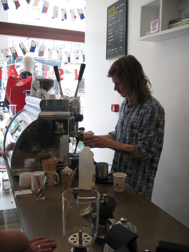 ниже указаны по порядку "где больше понравилось". везде пил эспрессо или как они обзывают short black. nude espresso - свой кофе на WEGA fernandez&wells - Has Bean Coffee на Synesso prufrock coffee at Present - Square Miles на Victoria Arduino, который сварил Маттиас Бйорклунд, шведский чемпион 2009 taylor st baristas - Union на Nuova Simonelli milk bar - Square Miles на Марцоке какая-то панковская кофейня на Brick Lane - Union на Rancilio в основном все используют 2ю закладку 18-20 г, варят на "бездонном" холдере. очень интересный момент - 90 % продаж = кофе с молоком - всякие латте, капучино, флэтвайты. например, в prufrock 70 % продаж - это flat white!!! на выставке пил: coffee collective (дания), daMatteo (швеция), terroir coffee (US), small batch roasters (австралия), taf (греция) + локальные union, matthew algie. весь кофе очень разный, но самым вкусненьким для меня оказался matthew algie. само мероприятие - СУПЕР. все построено на основном чемпионате. как мне показалось латте-арты, кофе-алкоголи и ибрики вообще никому не интересны, не говоря уже об аэропрессе и сифоне.
