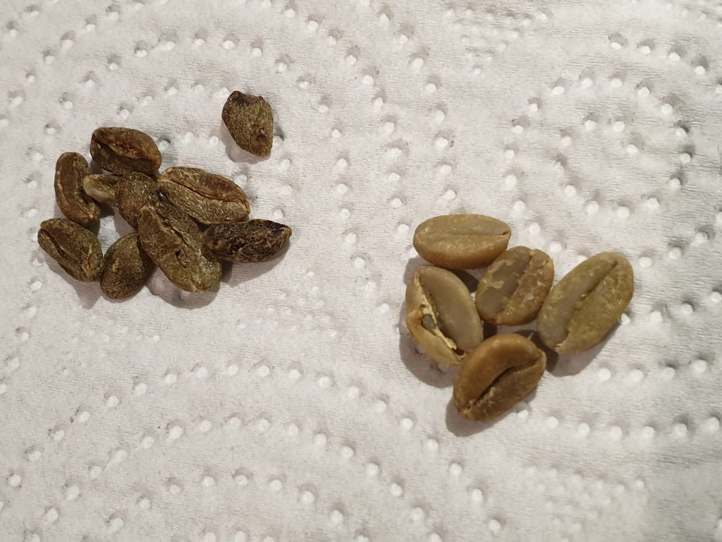 Теперь по самому зерну Эфиопия. Перед обжаркой из 400 г набралось штук десять темных зерен не внушающих доверия, которые выкинул (на фото для сравнения с нормальными):