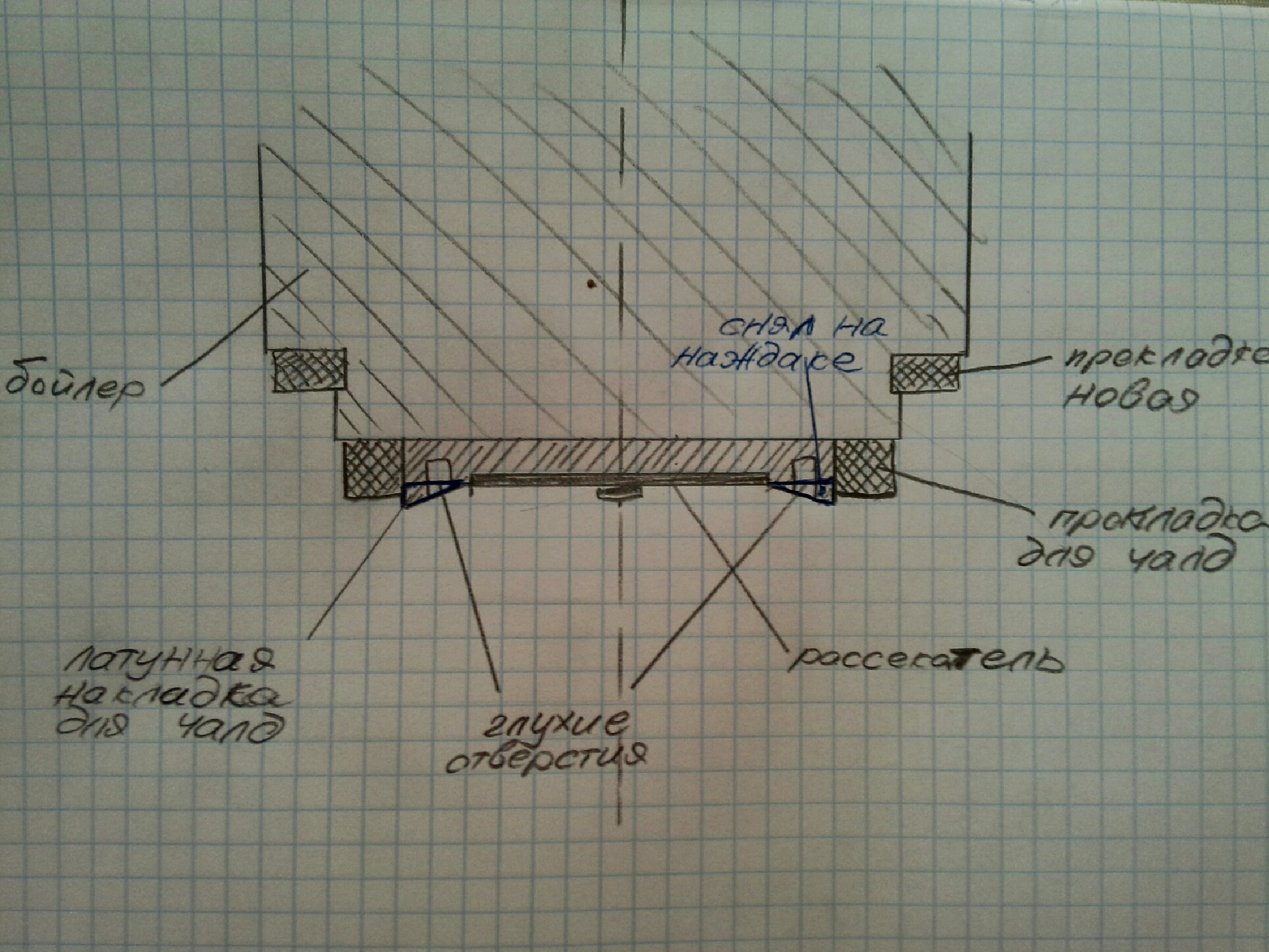 Подошло кольцо, La Marzocco H6, вот такое: -[ссылка]- Его размеры 72x55x6 mm. Правда, пришлось сточить его на наждаке до толщины 4.6 - 4.7мм, так как она должна попасть в специальный паз для нее. Если не сточить, то прокладка не садится плотно на свое место и при проливе с кофе в рожке - подтекает . Фильтр группы оставил почти без изменений, выкинул резиновую прокладку для чалд, открутил латунную накладку, которая приживает чалды (для откручивания в ней 2 глухих отверстия) и сточил ее немного, чтобы потоньше была (у нее края выступают больше чем средняя часть с фильтром группы). У меня корзина от La Cimbali на 14-16, если сыпать в нее больше 14 грамм, то таблетка при разбухании все равно сильно прижимается к накладке (особенно по краям), поэтому думаю сточить ее еще немного, чтобы она на "нет" сходила к краю. Вот схематический рисунок по-быстрому набросал, чтобы было более понятно читать мои сумбурные описания...