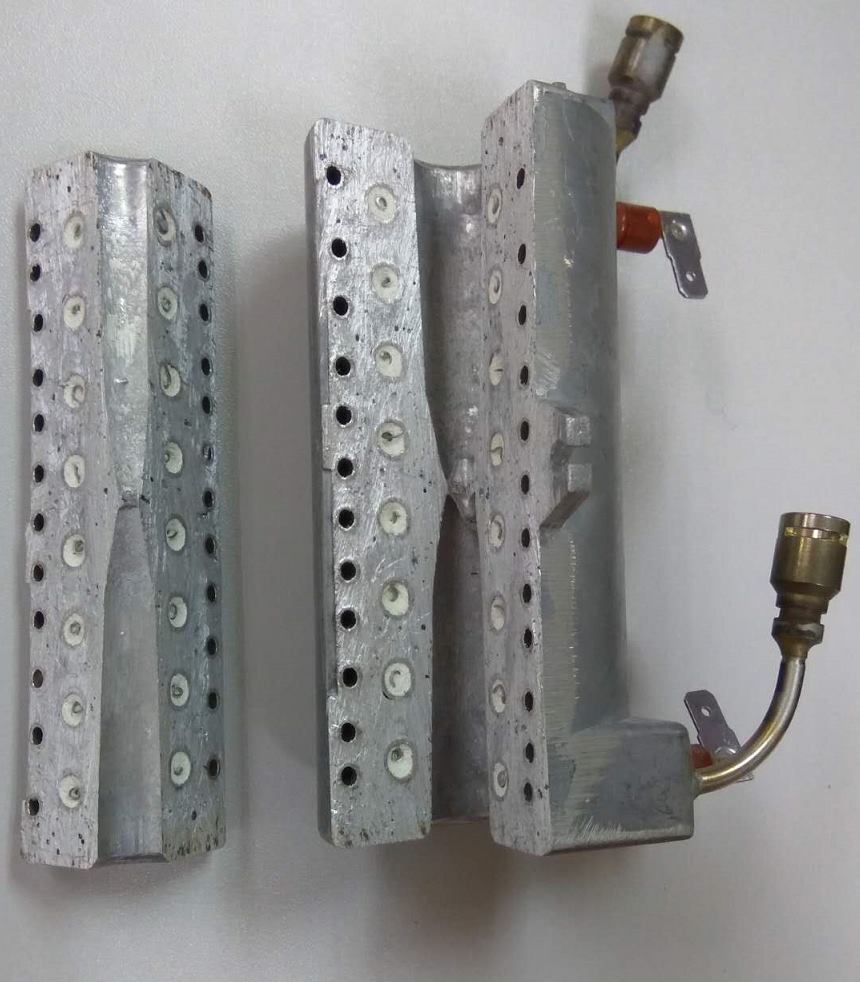 To move things forward, we sliced through one of our heaters in order to see what's really inside, as much as we can. We know that the water tubing is 304 stainless, and the insulating material around the heater coil is magnesium powder. We don't yet know what the heating element is (but it's probably nickel-chrome) and we're pressing to be confirmed that's the case, and at what diameter (though we can dig it out and measure it).