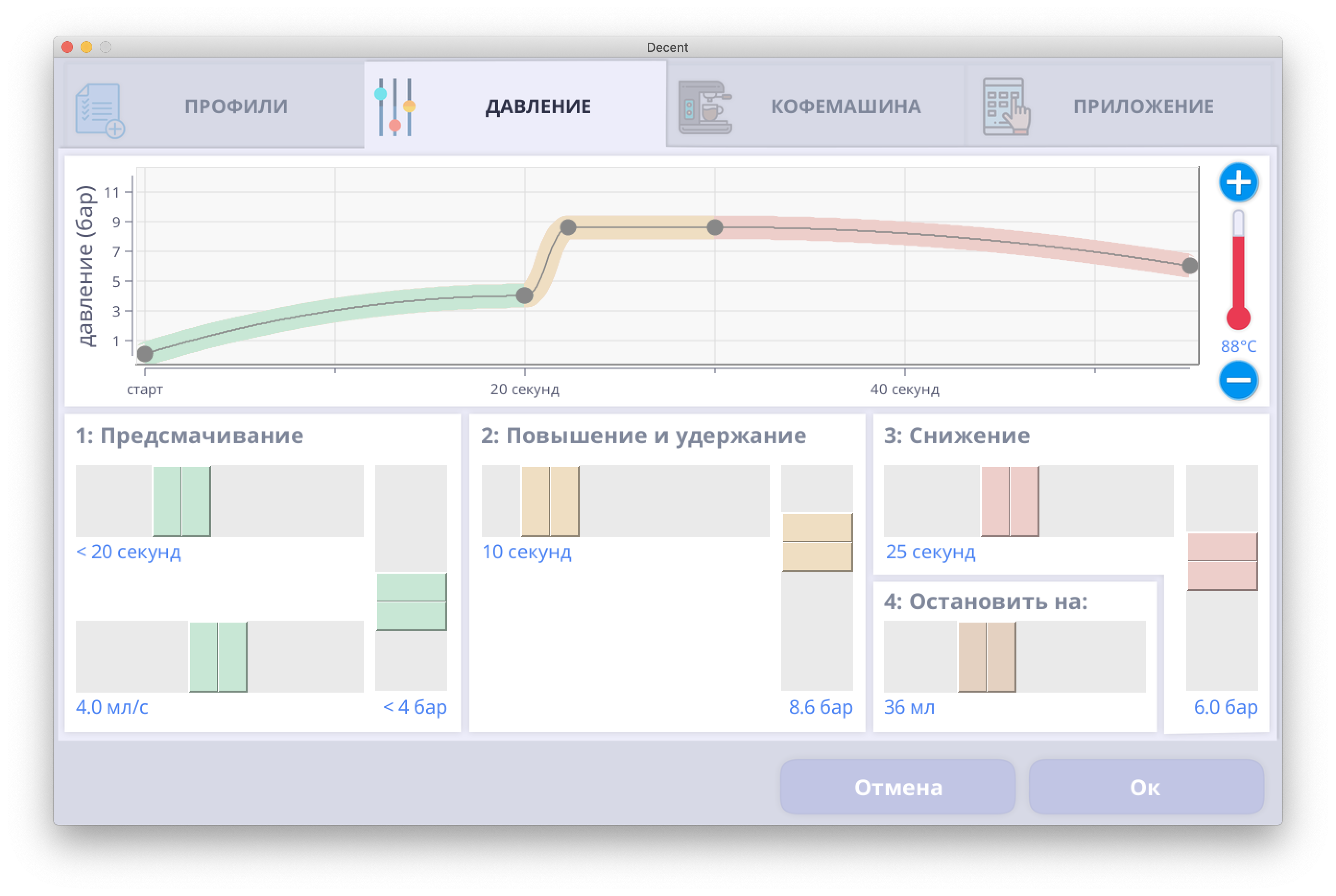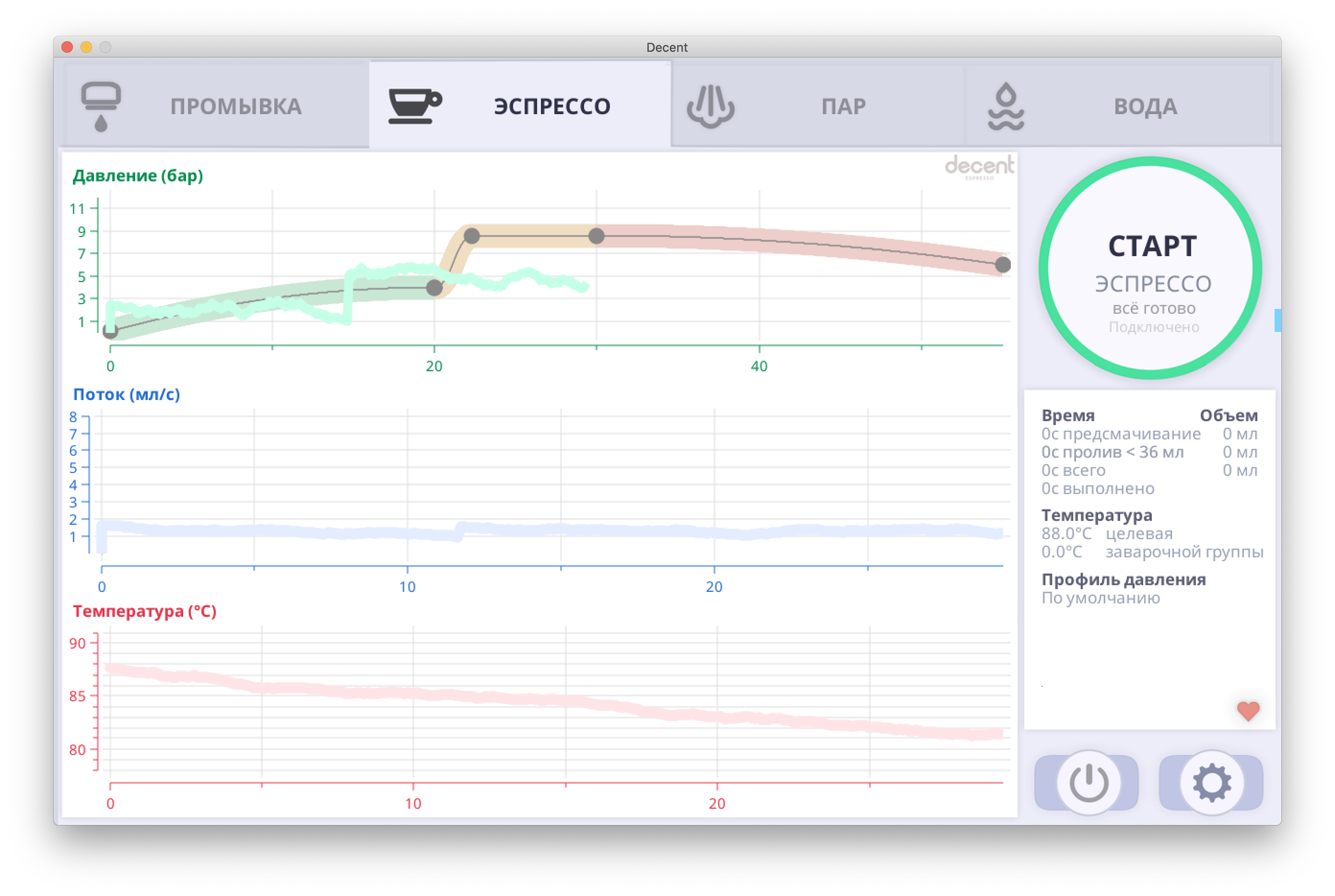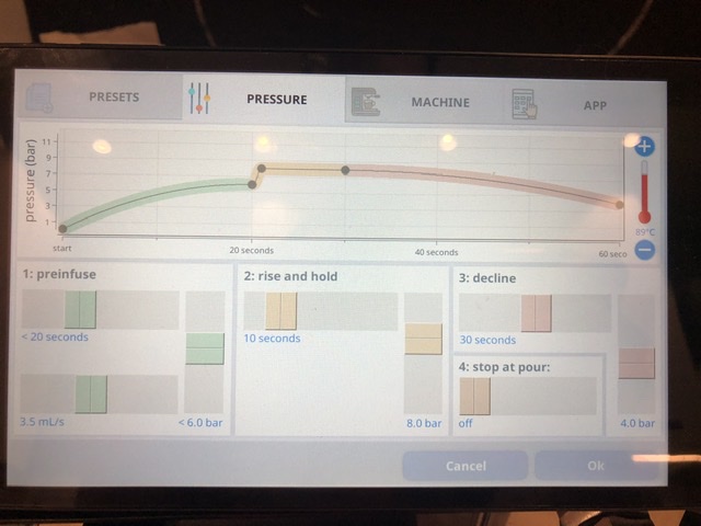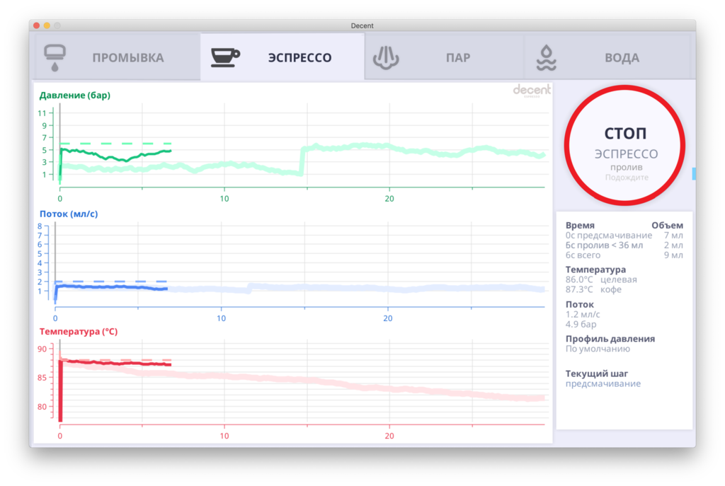 Про упрощение хочу написать. 1. Очень понравилось как реализовано предсмачивание. Оно не по времени, а по фактическому наполнению таблетки водой. Машина с заданным потоком будет лить воду до достижения целевого давления на этапе предсмачивания, а после выходит на рабочее давление. 2. Остановить пролив можно по достижении веса (если есть фирменные Блютус весы), либо по объёму в чашке (машина считает пропущенный объём воды, в том числе с учетом фазы предсмачивания. Пролив с картинки был с закладкой 14,5 гр и выходом 30 гр по обычным весам.