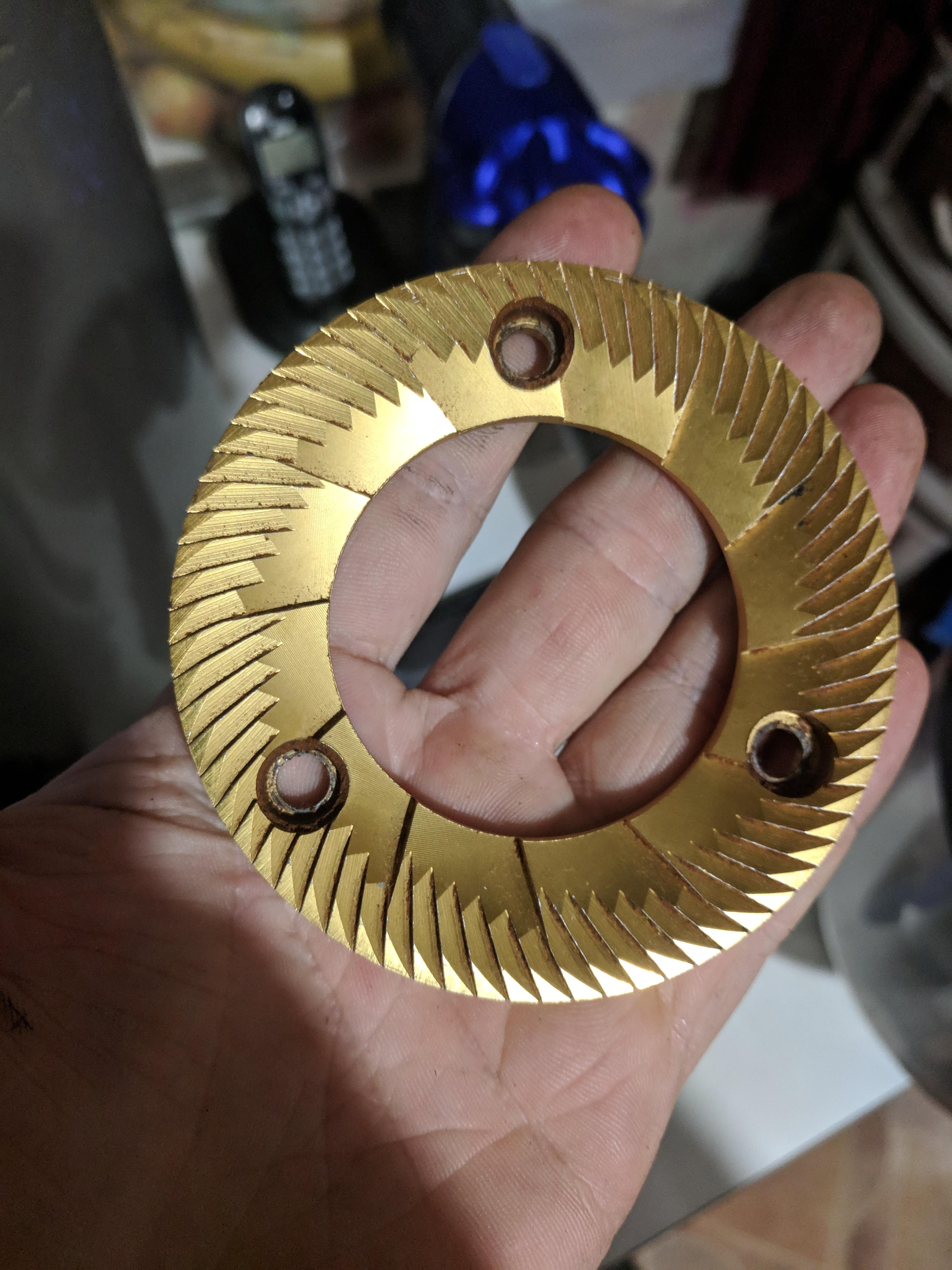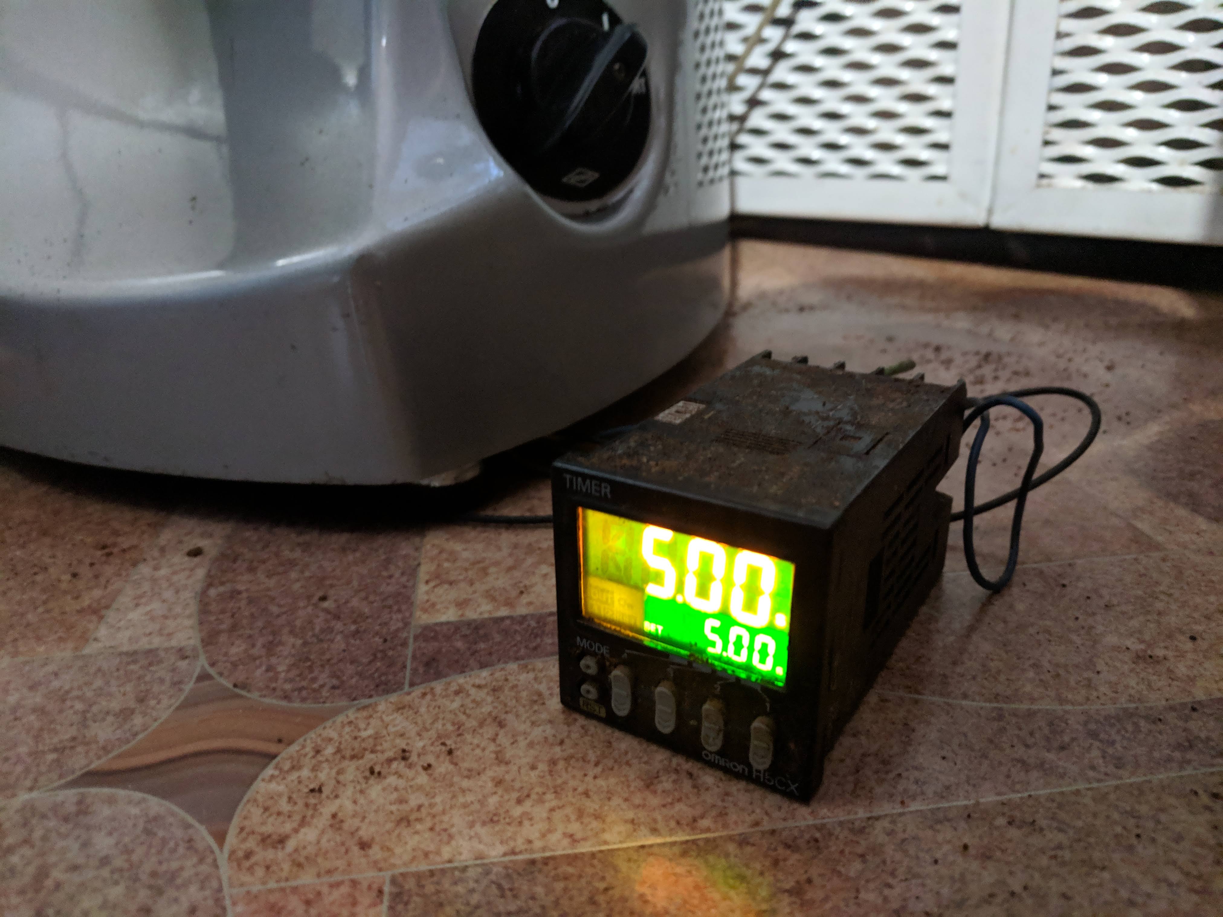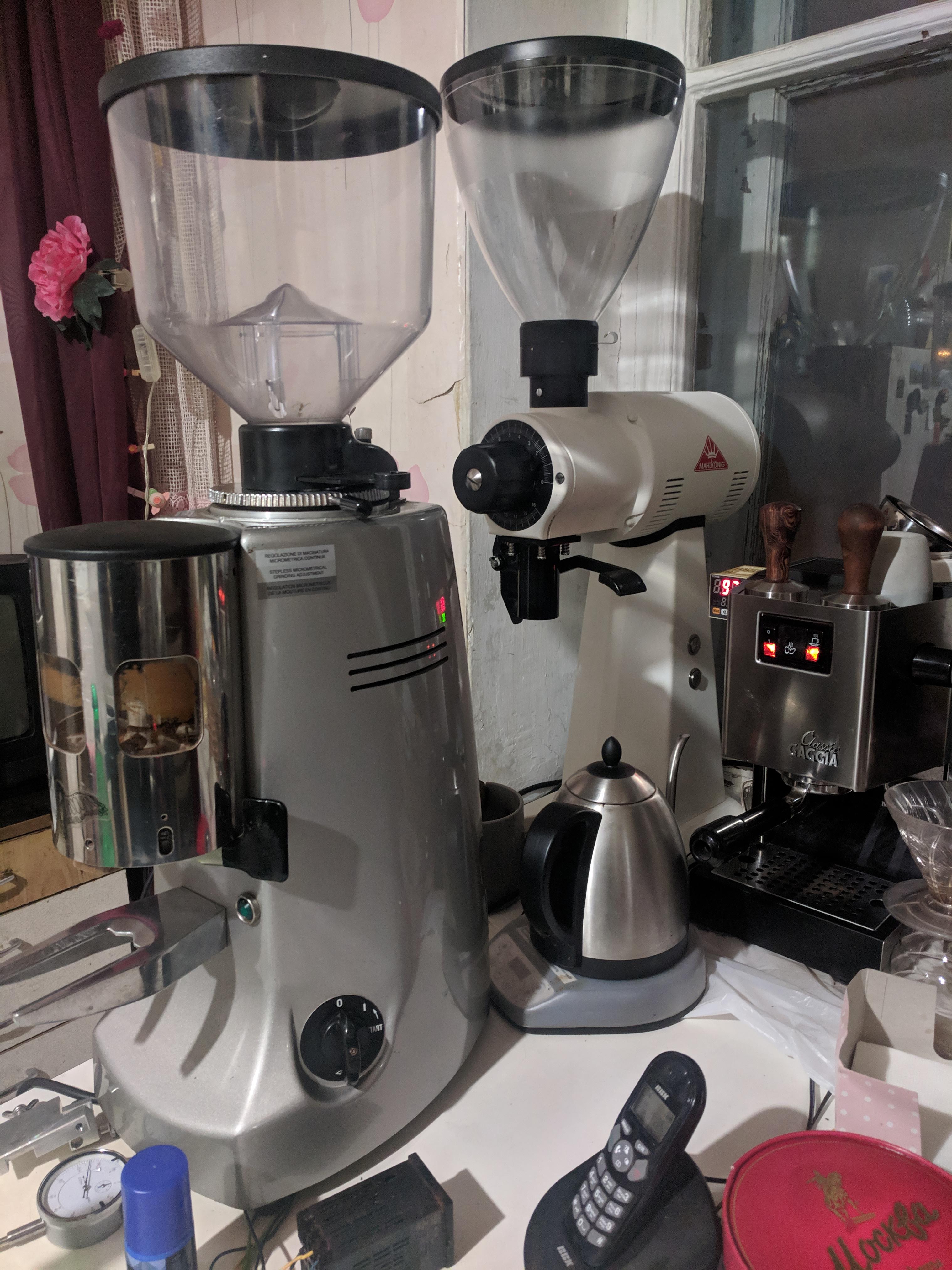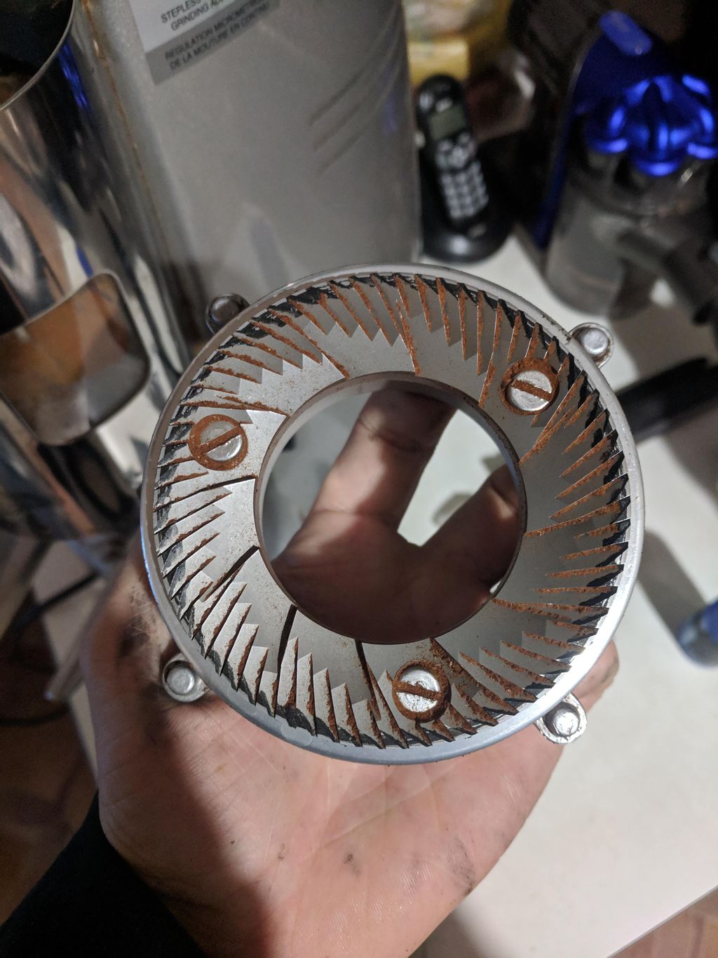 - Таймер Omron H5CX — можно устанавливать точность времени помола до 0.01 cек. Болтается на проводах. Можно запилить в корпус, но мне было лень. - Два комплекта жерновов: - Те, что стояли на момент покупки, с титановым покрытием, для эспрессо. Состояние хорошее, эспрессо вкусный. - Почти новые 151F от mazzer ZM filter. Отличаются заточкой, в особенности выходным каналом. На ZM он глубже, поэтому дает меньше пылевой фракции. Вообще кофе варится оч хорошо. - В дозер установлены пару простых улучшений: наклейка на лопатки, чтобы весь кофе сгребался из бункера и не оставалось помола, и небольшая воронка, чтобы кофе ссыпался по центру холдера.