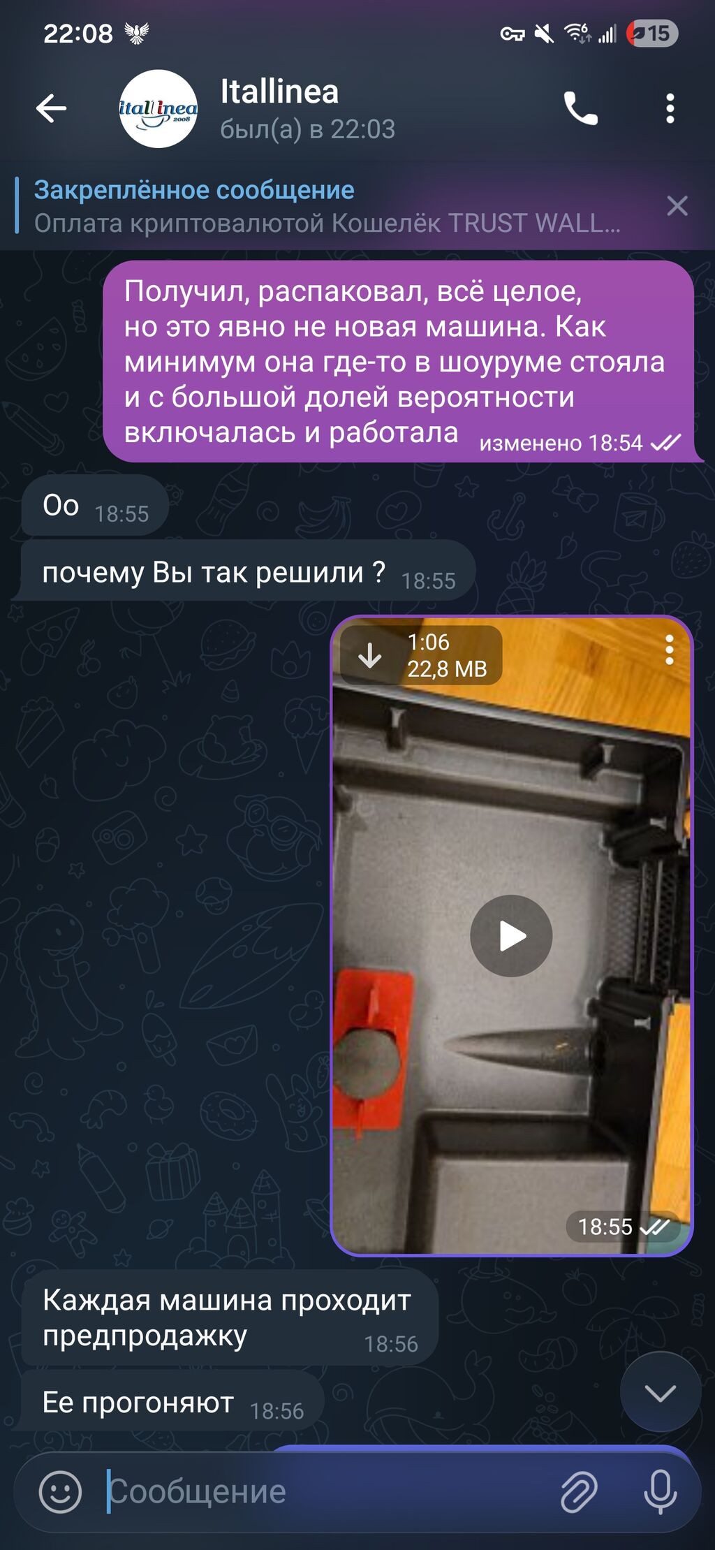 Все верно, Олег. Вы написали что "ок, вскрою, дам знать" ещё до того как я согласился на это. На видео можно ли рассмотреть что машина не новая? Конечно нет. На видео запечатанной была только коробка с холдером, которую вы назвали "целкой" и привязанный ярлычок на верёвочке к машине на узелок. Как выглядит новая машина в коробке и ее распаковка, видео я вам прислал, и там прекрасно понятно что эта была упакована далеко не так. Я думаю причины для якобы вскрытия новой коробки с вашей стороны были 2, точнее даже 3.