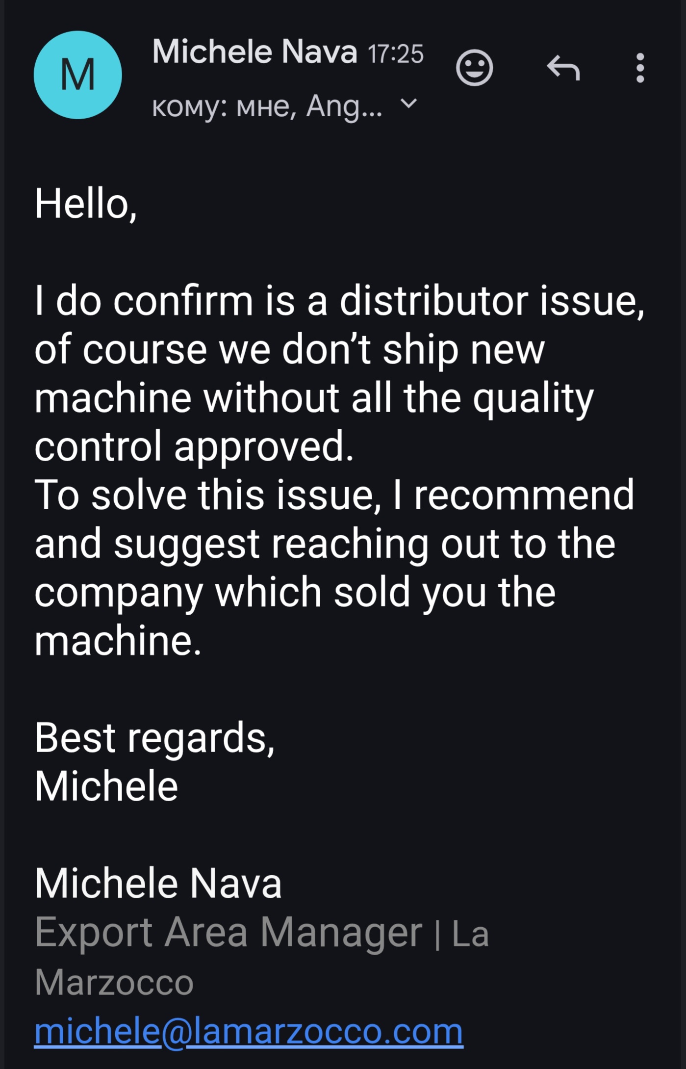 Всем привет!Отзыв о покупке кофемашины в italinea.В середине ноября списался с Олегом уточнили все детали,28 ноября сделал оплату usdt за аппарат la marzocco linea mini r из наличия,был предупрежден Олегом что до НГ можем и не успеть т.к хотел получить до НГ.В итоге 24-го декабря получил весточку что аппарат в Москве и можно забирать со склада.Забрал на след.день,все в идеале как и расчитывал,все счастливы)Спасибо Олегу за классный аппарат и быструю доставку.Всех с наступающим НГ!