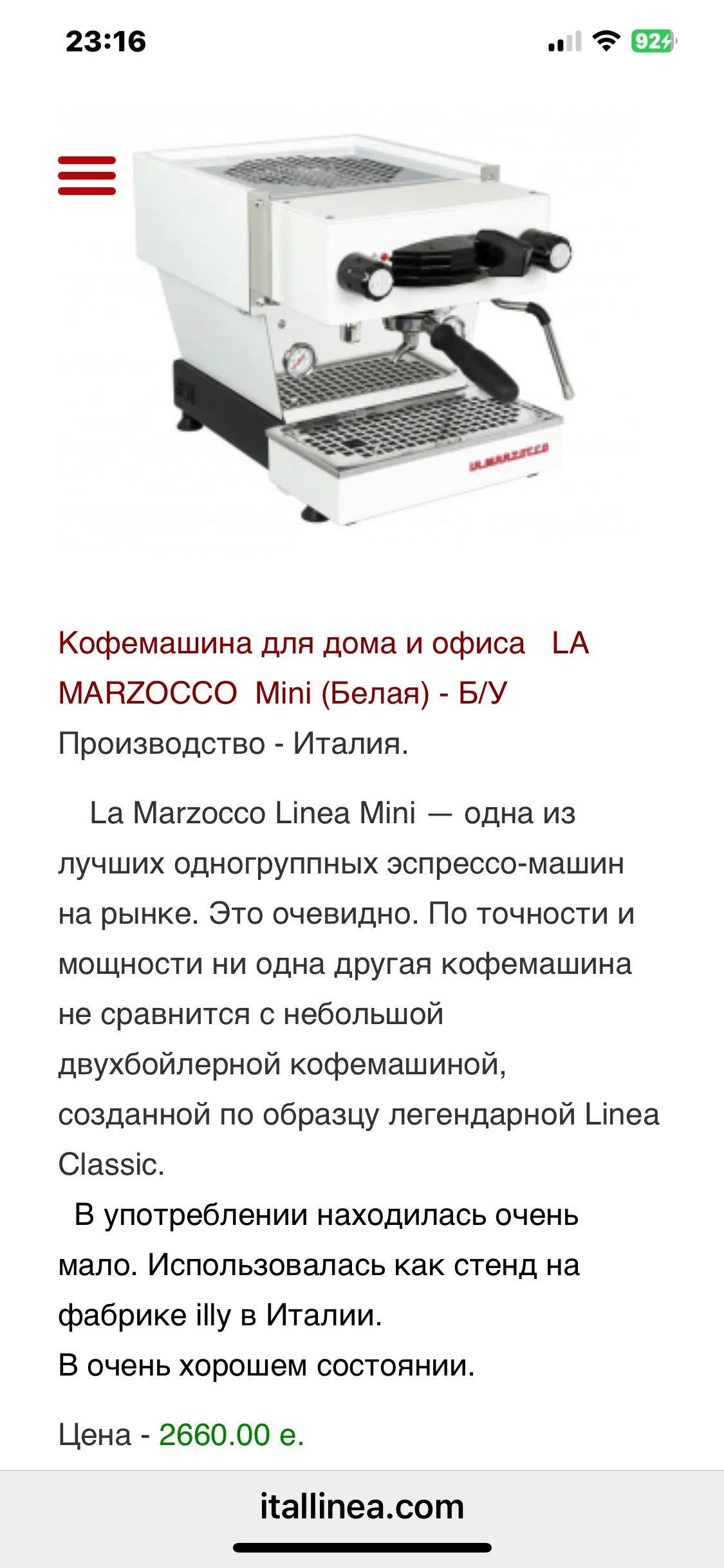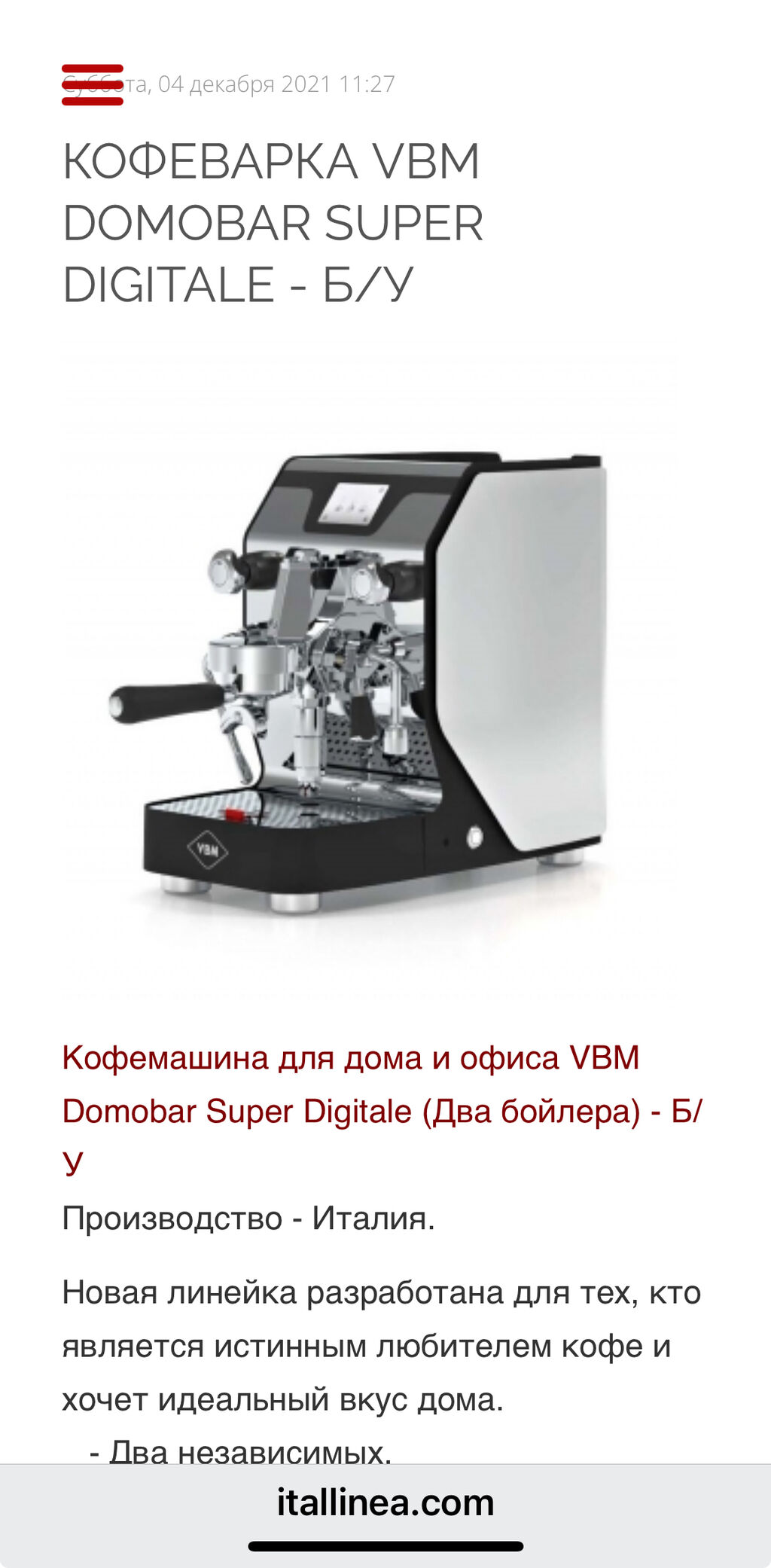 Chin@: Я сейчас снова посмотрел на сайте, у Олега в наличии на складе есть две LMLM( Mini) б/у в районе 2600€ и он продаёт свою годовалую VBM Domobar Super Digital за 1400€. Если вас это устраивает, то из наличия доставка всяко быстрее заказа с завода. Да и за такую цену можно и подождать имхо. Бьянка неплохая машина, но не мой выбор. Если бы выбирал из того, что вы смотрите, то скорее LMLM б/у у Олега из-за цены, не думаю, что мне для дома при всех возможностях нужна Sanremo You, хотя машина продвинутая. Но это мои тараканы и кстати у той же VBM - Domobar Super Digital очень неплоха за 1400€