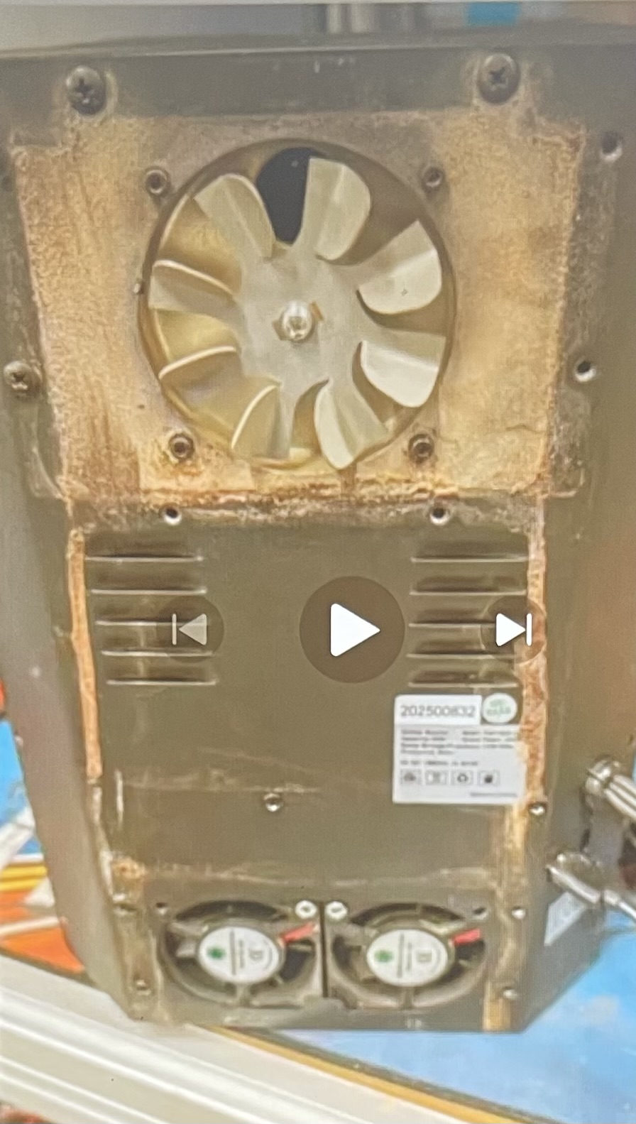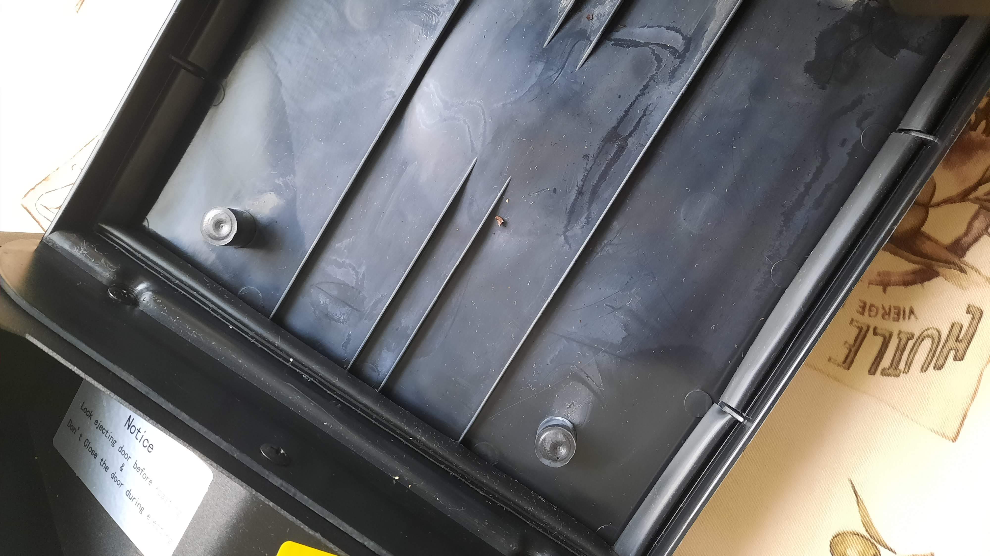 Из видео на YouTube по ростерам CBR для тех, кто пользуется трубой на выхлопе, а не штатный фильтр, в коробе задней верхней части ростера происходит оседание кофейных отложений и конденсата из трубы. Автор говорит, что такое происходит также у его друзей. Рекомендует: уплотнить кожух снизу, открывать и чистить внутренние поверхности кожуха и лопасти вентилятора раз в месяц, также при использовании трубы рекомендует устанавливать бустер (доп вытяжной вентилятор для трубы), чтобы не скапливался конденсат. Если этого не делать, то конденсат вкупе с продуктами кофейного выхлопа постепенно стекает вниз, а далее через низ в окна вентиляции попадает внутрь в район usb и плата выходит из строя. Вот скриншот из видео, где видна вся картина