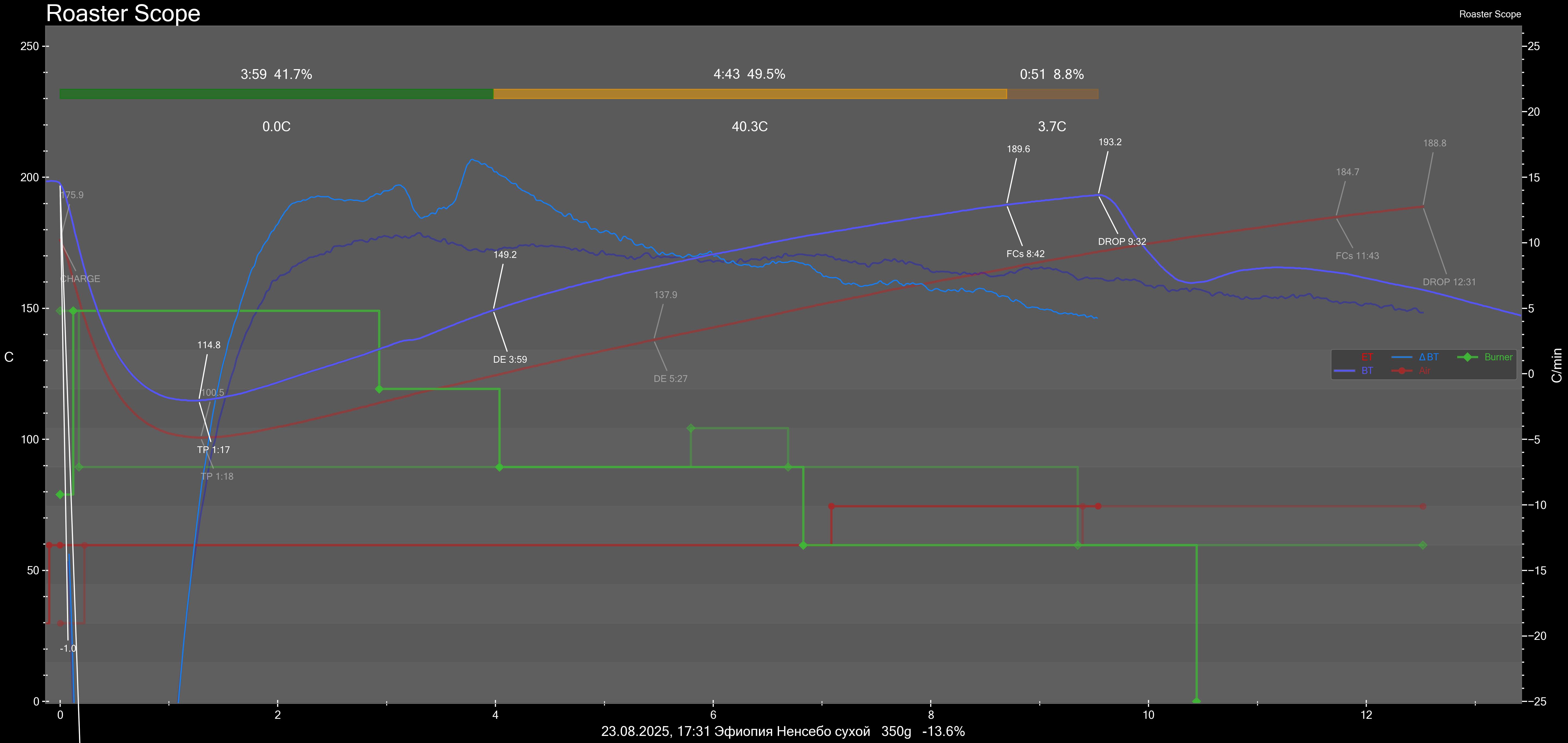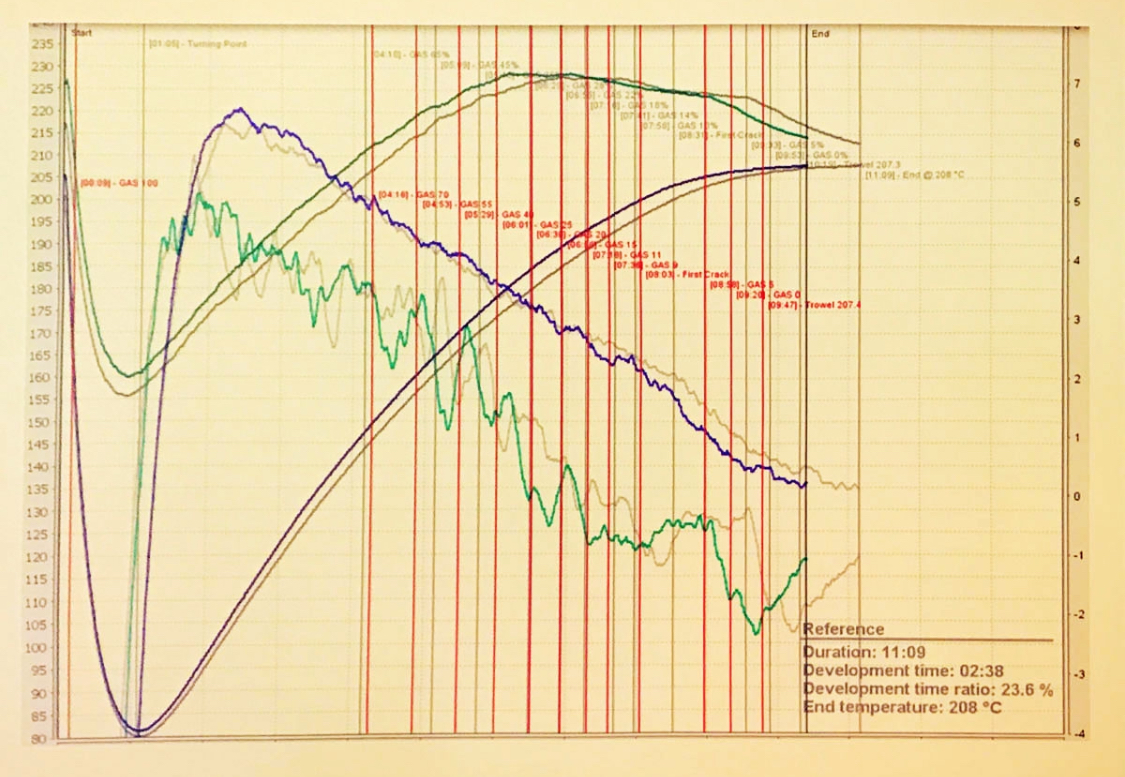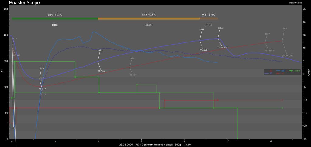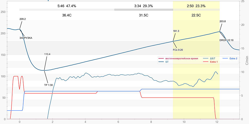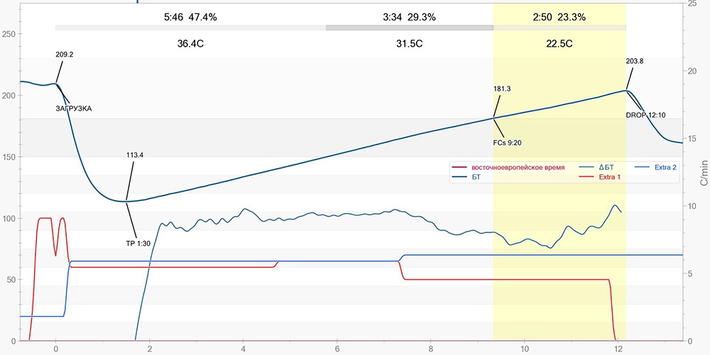 Во первых, этот график вызывает сомнения, так как кривые на нем, как будто бы, не соответствуют друг другу. Если справа это шкала скорости роста температуры (ROR) в гр./мин, то почему максимальная скорость 6 гр./мин, когда должна быть не менее 12 гр/мин, чтобы обжарка была за 10 минут: изменение температуры за время обжарки делим на время обжарки = средняя скорость роста (208-80)/10=12,8 гр/мин. Поэтому возникает подозрение, что либо график неверно нарисован, либо единицы измерения на нем другие - в любом случае на него тогда невозможно ориентироваться. Во вторых, сейчас я подобрал начальную мощность, так что меня вкус наиболее устраивает, при этом получается около 12 минут при светлой обжарке. И зачем вот мне портить вкус кофе, чтобы повторять какой-то график с ошибками?