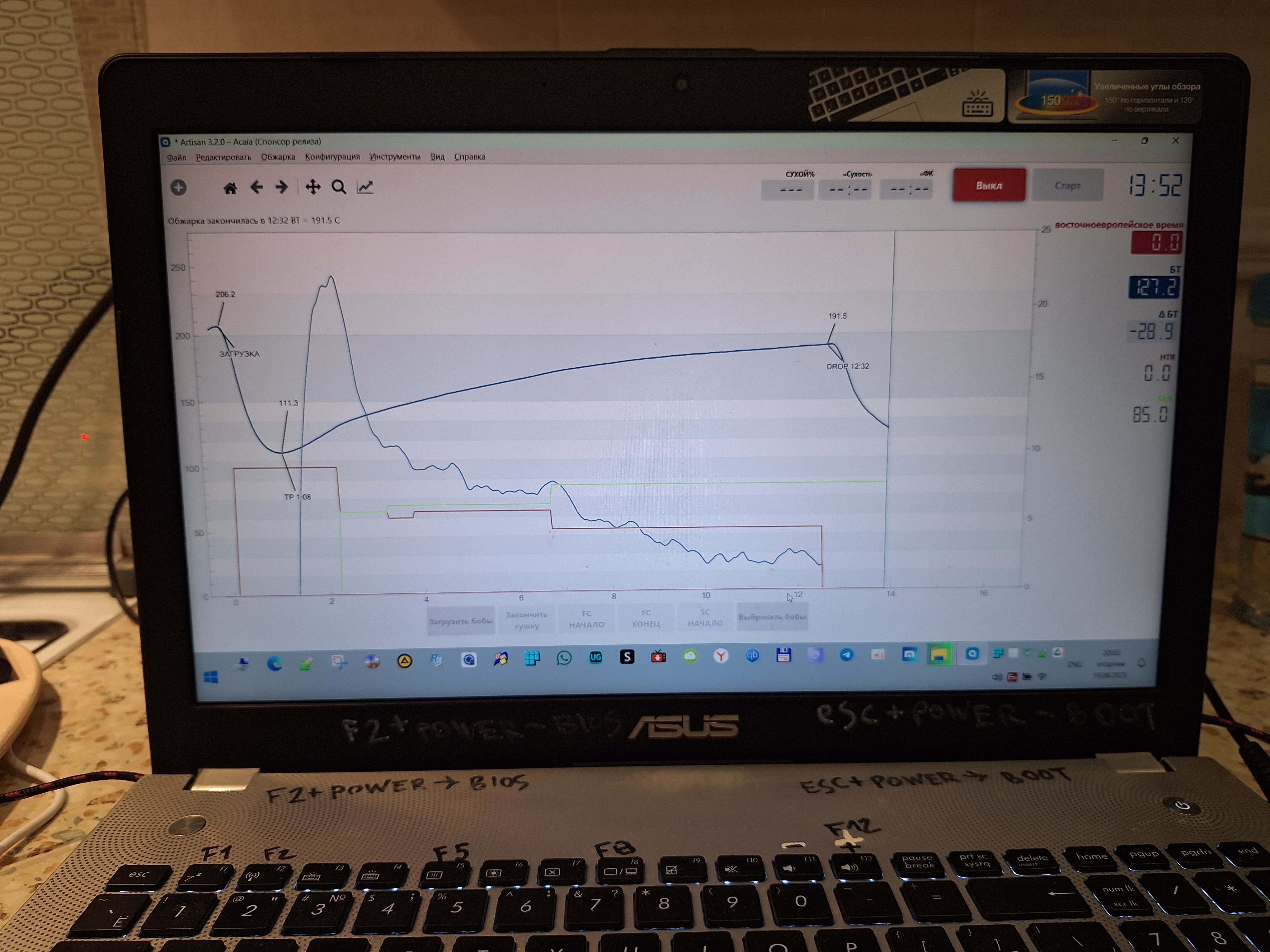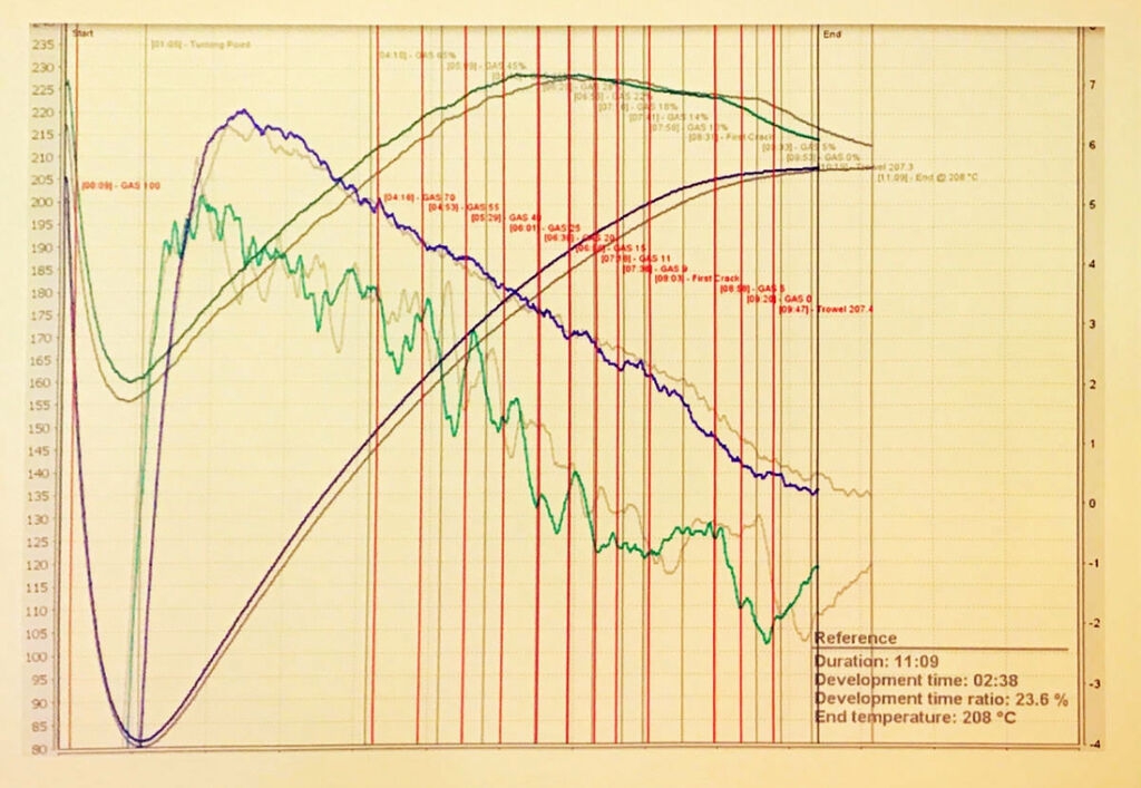 Пришла CBR-1 наконец-то (почти месяц шла). Сразу сделал темную обжарку на автомате (023 программа). ROR вышел очень посредственный (похоже на недоразвитие). На зуб зерно тоже безвкусное. Надеюсь, что это первый блин комом. Потенциал у аппарата хороший. Намного удобнее, чем жарить вручную. Вывел трубу под вытяжку, но в последние две минуты вся кухня в дыму была. Очень удобно мониторить процесс через Artisan. Но, похоже, нужен ручной режим управления, чтобы получить хорошую ROR.