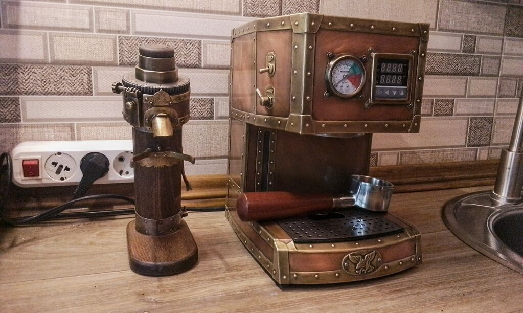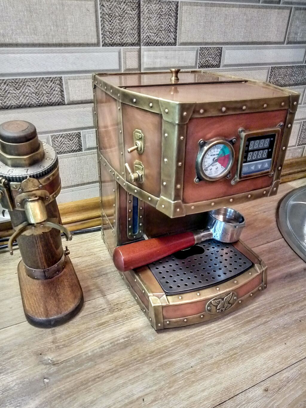 Крайний апгрейд моей многострадальной кофеварки. На этот раз занялся внешним видом, чтобы сочеталась с моей самодельной кофемолкой, оформленной в стиле стимпанк.