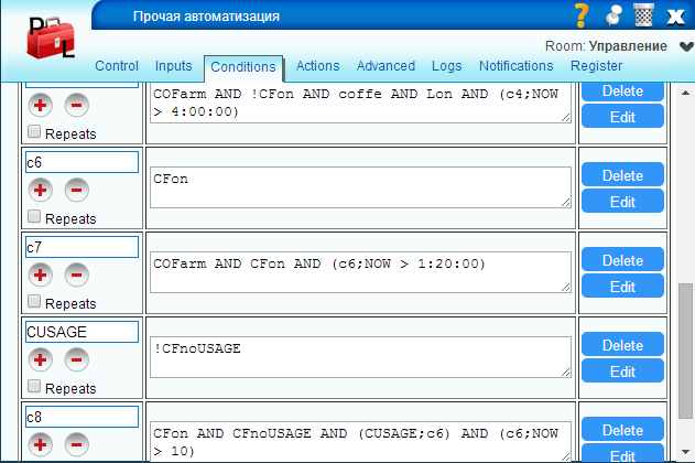 Сейчас настроено автоматическое включение кофеварки утром на прогрев. Причем хитрое - кофеварка включается утром как только включится свет в ванной (кто-то пошел принимать душ).Сделано специально, чтобы в праздничные дни она не будила своей работой. Также в 22 часа включается ровно на 20 секунд, чтобы возможно пополнить бойлер водой (звук работы помпы громкий, поэтому лучше она заполнит с вечера, чем с утра разбудит остальных домочадцев). Есть и голосовое оповещение в случае когда питание кофеварки включено, а кнопка на ней не нажата (через замер потребляемой мощности, до этого оставались пару раз без кофе забыв нажать кнопку с вечера).