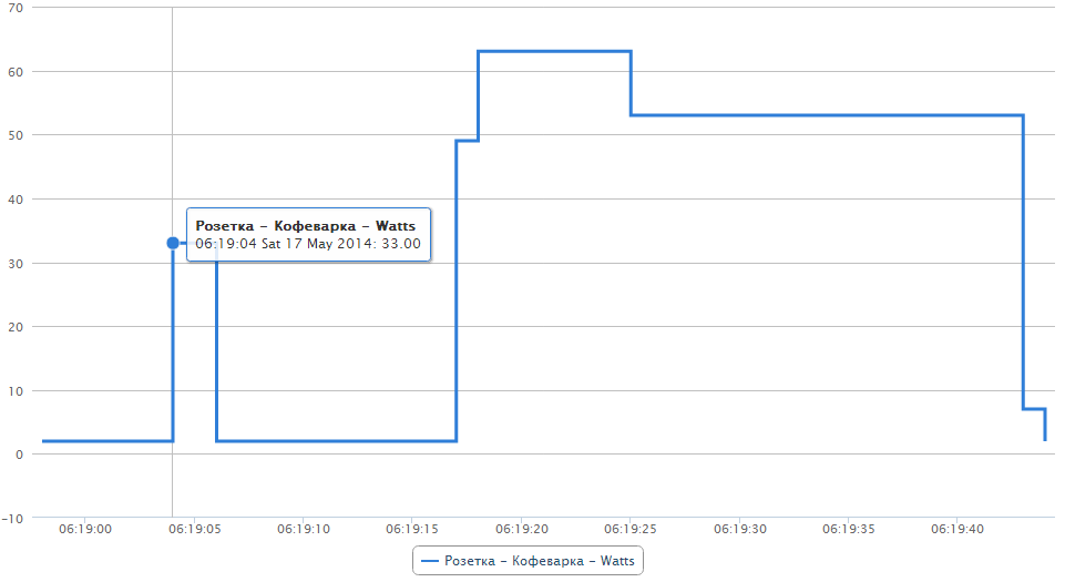 Недавно начал строить систему "Умный дом" у себя и получилось снять график разогрева кофеварки, подумал может кому будет интересно.