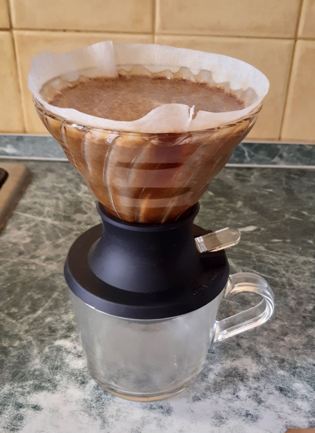 Пришла иммерсионная воронка Харио. Заваривал новый кофе , величину помола оставил стандартную для воронки , взял опять же стандартные "плипорции" 250 /15 , 95 градусов Настаивал 3 минуты и открыл клапан слива. На коробке приведена рекомендация по времени настаивания от 2 до 7 минут Сложно пока сравнивать, но кофе получился весьма кислотный, горечи нет. То ли сорт, то ли с величиной помола/ временем заваривания нужно что-то делать. Сам девайс весьма приятный и качественный. Нижняя часть из упругой толстой резины. Высокая термостабильность за счет толстого предварительно нагретого стекла. Удобно прогревать : налил кипятка при закрытом клапане, подождал минуту и слил. Можно также использовать как обычный пуровер без иммерсии