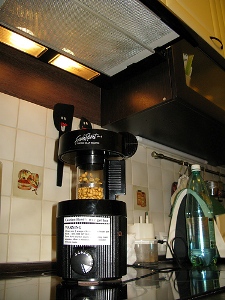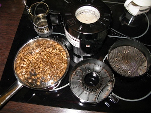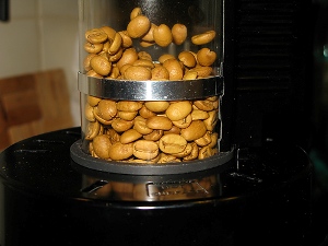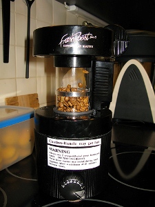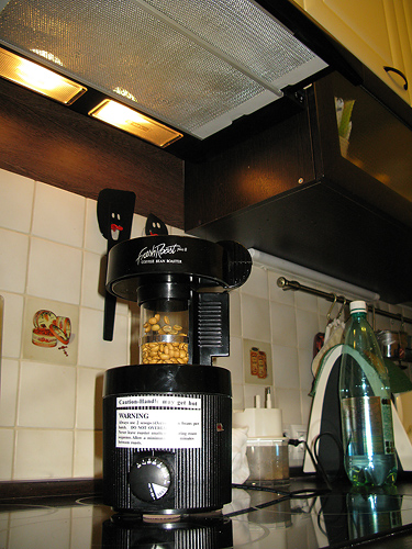 Пошарив по coffeegeek.com, я нашёл неплохой, а главное - дешёвый агрегатик, FreshRoast Plus8 производства американской компании Fresh beans, Inc. Штатовская цена у него в районе 75 долларов, я же брал на Invalsa.com европейскую (230V, 50Hz) версию, которая тогда обошлась мне в 99 уёв, сейчас же стоит около 120. Доставка обошлась ещё в тридцатку, в итоге я потратил на агрегат почти 4 тысячи рублей. Через две недели, аккурат в день своего рождения, я забрал посылку на почте. Вместе с ростером я получил фунт бесплатных зёрен (Боливия, класс премиум).