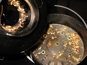 После обжарки аккуратно снимаем фильтр-крышку (чтобы вовнутрь не упала шелуха) и высыпаем обжаренный кофе в какую-нибудь прохладную плошку. На выходе получается 50 г кофе, поэтому чтобы набрать на стандартную пачку, приходится жарить 5 раз… Следующий цикл обжарки можно будет повторить (судя по надписи на боку прибора) через 20 минут – нужно, чтобы все детали остыли. К тому же внутри есть термодатчик, и если прибор, предварительно не охладив, зарядить на очередную обжарку, то второго крэка вы не услышите. Его просто не будет, а сам кофе, не дожарясь, будет мелким и сухим, и шелуху не отдаст. Но это можно обойти, если сразу после обжарки включить базовый блок без чаши в цикл охлаждения. Тогда жарку можно будет начать через 5-7 минут. На обжарку полкило кофе в таком режиме я тратил примерно два часа.